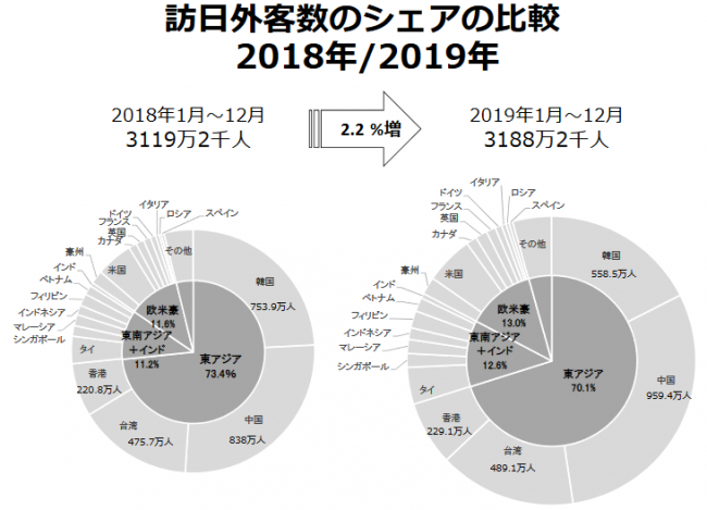 2019年の年間訪日外客数は、前年比2.2%増の3188万2000人で、JNTOが統計を取り始めた1964年以降、最多となり、韓国を除く19市場で過去最高を記録した。