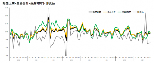 スーパーマーケット販売統計12月度が発表された。一般社団法人日本スーパーマーケット協会(JSA)、オール日本スーパーマーケット協会(AJS)、一般社団法人全国スーパーマーケット協会(NSAJ)の会員企業270社の調査結果だ。