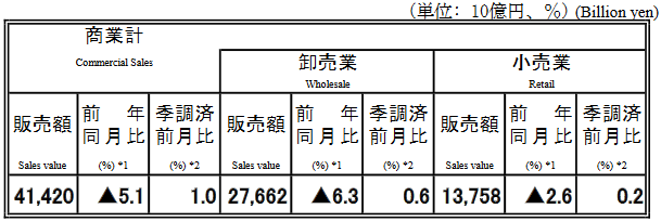昭和28年(1953年)から始められた商業動態統計は、国の基幹統計である。小売業・卸売業を営む企業と事業所・店舗の事業活動に関する動向の把握を目的とするもので、毎月、調査・発表される。その12月の商業販売額は41兆4200億円で全年同月を5.1%下回った。商業販売額は小売業と卸売業のすべての販売額である。