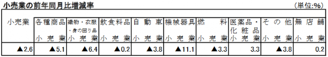 小売業の販売額は13兆7580億円で2.6%のマイナスだった。医薬品・化粧品の3.3%増と無店舗小売業の0.2%増以外はすべて減少している。