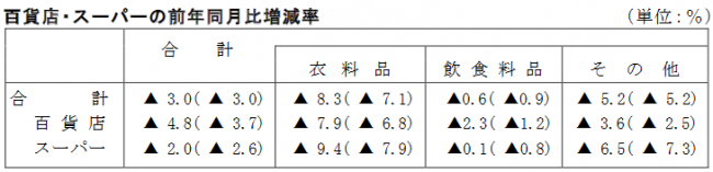 百貨店・スーパー販売額は2兆0195億円、前年同月比3.0%のマイナス。百貨店は7049億円の4.8%減(既存店は3.7%減)、総合スーパーは1兆3146億円の2.0%減(既存店は2.6%減)となった。衣料品は8.3%の減少、飲食料品も0.6%の減少だ。