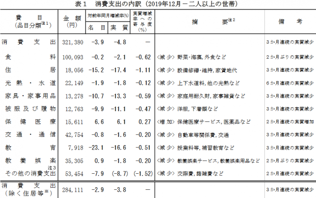 12月の「家計調査報告」速報が、総務省統計局から発表された。
