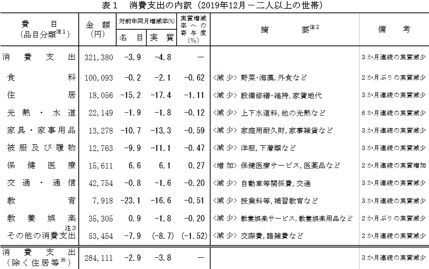 12月家計調査統計|2人以上世帯の消費支出3.3%減、増税後3カ月マイナス