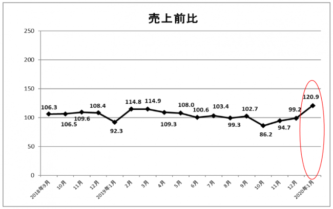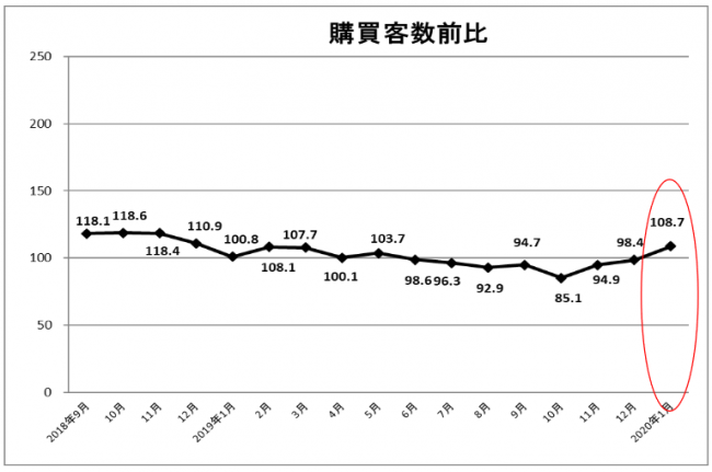 売上高、客数、購買単価、いずれもプラスに転じたのは、春節が2019年は2月5日だったが、2020年は1月25日であったため、月ズレが生じた影響が大きな要因となっている。