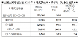 1月度は宅配が前年比0.5%減と低迷したことから総供給高も前年比1.0%減となった。一方、店舗は増税後の客数減が続いていて、前年割れとなった。分類別では農産、水産が不調だった。宅配は年末は好調だったものの、年始は落ち込みがあり、前年比99.5%となった。