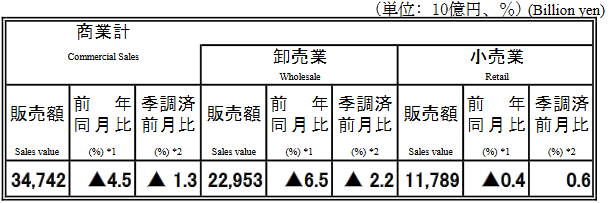 その1月の商業販売額は34兆7420億円で全年同月を4.5%下回った。商業販売額は小売業と卸売業のすべての販売額である。