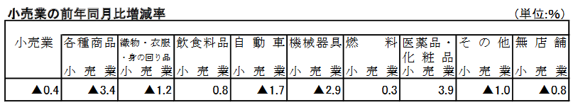 内訳は、医薬品・化粧品小売業が3.9%増、飲食料品小売業が0.8%増、燃料小売業が0.3%の増加となったが、一方で、各種商品小売業(百貨店など)が前年同月比3.4%減、機械器具小売業が2.9%減、自動車小売業が▲1.7%減、織物・衣服・身の回り品小売業が1.2%減、その他小売業が1.0%減、無店舗小売業が0.8%の減少だった。