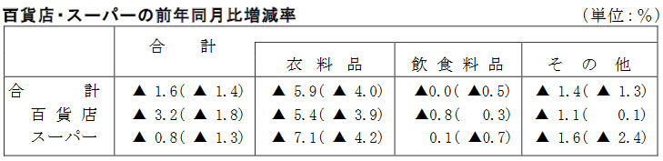 百貨店・スーパー販売額は1兆6064億円、前年同月比1.6%のマイナス。百貨店は5211億円の3.2%減(既存店は1.8%減)、総合スーパーは1兆854億円の0.8%減(既存店は1.3%減)となった。衣料品は5.9%の減少、飲食料品は0.0%の横ばいだ。