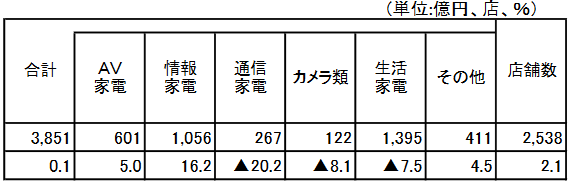 カテゴリー別では、情報家電が16.2%増、AV家電が5.0%増、その他が4.5%増加となった。一方、通信家電が20.2%減、カメラ類が8.1%減、生活家電が7.5%の減少となった。