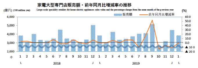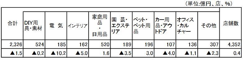 カテゴリ-別に見ると、電気が10.2%減、インテリアが5.0%減、カー用品・アウトドアが4.0%減、園芸・エクステリアが3.5%減、その他が2.3%減、オフィス・カルチャーが1.1%減、DIY用具・素材が0.2%の減少となった。一方、ペット・ペット用品が3.0%増、家庭用品・日用品が1.6%の増加となった。