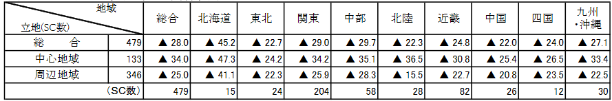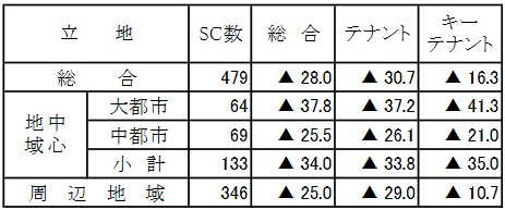 立地別・構成別では、中心地域はテナント▲33.8%、キーテナント▲35.0%と、ともに大幅に前年を下回り、全体では▲34.0%となった。とくに中心地域・大都市のキーテナントは百貨店の売上減少が響き▲41.3%まで落ち込んだ。
