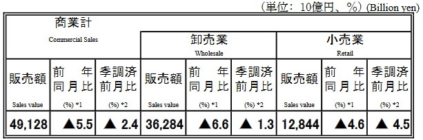 その3月の商業販売額は49兆1280億円で全年同月を5.5%下回った。商業販売額は小売業と卸売業のすべての販売額である。