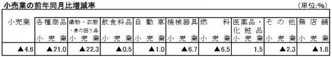 小売業のなかでは医薬品・化粧品小売業だけが1.5%増加した。織物・衣服・身の回り品小売業が22.3減、百貨店などの各種商品小売業が21.0%減と大幅に前年を下回った。機械器具小売業が6.7%減、燃料小売業が6.5%減、無店舗小売業が1.8%減、自動車小売業が1.0%減、飲食料品小売業が0.5%減とほとんどのカテゴリーが前年を下回った。