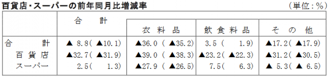 百貨店・スーパー販売額は1兆6204億円、前年同月比10.1%のマイナス。総合スーパーは1兆2417億円の2.5%増(既存店は1.3%増)だったが、百貨店は3787億円の32.7%減(既存店は31.9%減)の大幅減収となった。商品別では衣料品は36.0%減と大幅に減少したが、飲食料品は3.5%と伸長した。