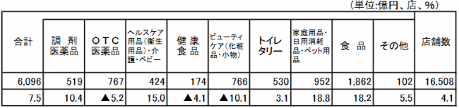 カテゴリー別に見ると、家庭用品・日用消耗品・ペット用品が18.8%増、食品が18.2%増、ヘルスケア用品(衛生用品)・介護・ベビー15.0%増、調剤医薬品10.4%増、トイレタリーが3.1%増加となった。一方、ビューティケア(化粧品・小物)が10.1%減、OTC医薬品5.2%減、健康食品が4.1%少となった。