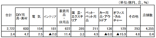 カテゴリー別に見ると、家庭用品・日用品11.4%増、ペット・ペット用品4.9%増、DIY用具・素材4.2%増、園芸・エクステリア3.3%増、電気が2.5%の増加となった。一方、オフィス・カルチャーが15.9%と大きく落ち込み、カー用品・アウトドアが6.0%減、インテリア2.0%の減少となった。新型コロナウイルスの感染拡大のため、外出自粛するため、自宅でできるDIYや園芸用品が伸長した。