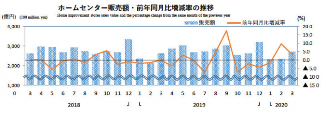 経済産業省発表の「商業動態統計速報」によるホームセンター3月の販売額は2772億円で、前年同月比3.4%の増加となった。店舗数は2月から6店舗増えて、4355店舗。
