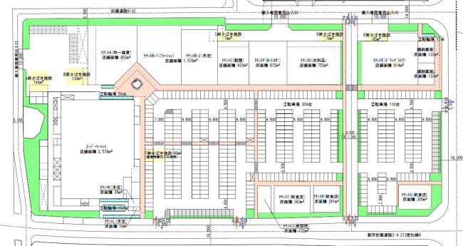 建物は鉄骨造平屋建て。主な小売業者は(株)バローが入居する。スーパーマーケットの店舗面積は2576㎡(781坪)。他に衣料品・ドラッグストア・均一雑貨や飲食店など15のテナントが入居する予定だ。駐車場は平面で2カ所配置し、計419台収容する。駐輪場は205台の収容だ。新設予定日は11月14日。