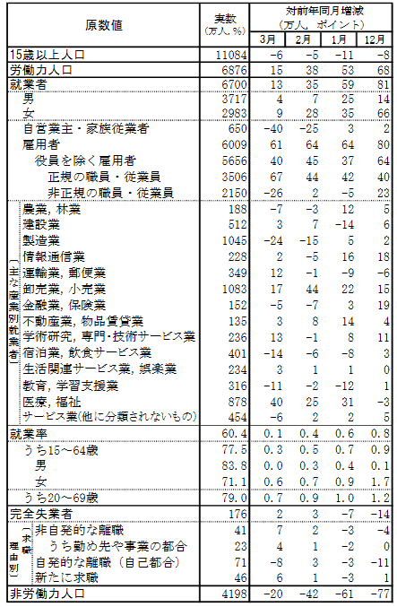 総務省統計局の3月の「労働力調査」によれば、就業者は6700万人と前年同月に比べて13万人増加した。雇用者は前年同月に比べて61万人増加の6009万人。いずれも2014年1月から87カ月連続で前年同月を上まった。