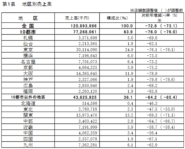 大都市の10都市では72.8%減、地方の10都市以外でも64.2%減だった。