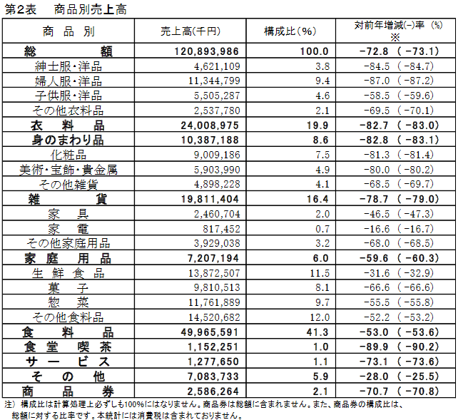 多くの店舗が食品フロアの営業を継続したことから、食料品は百貨店全売上高の4割以上のシェアを占める結果となった。巣ごもり消費から、ECサイトでは2倍以上の伸びを示す店舗も見られるなど、急伸した。とくに、食料品、化粧品、婦人バッグ、衛生用品などが動いた。