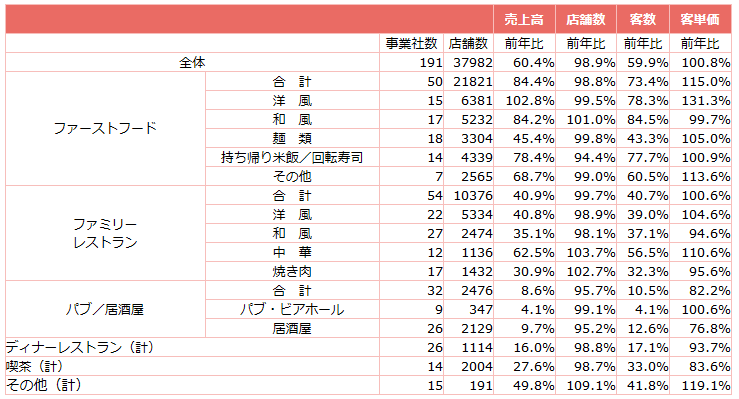 なかでもパブの売上げは前年比4.1%、居酒屋は9.7%と一桁台、ディナーレストランは16.0%、喫茶は27.6%とそれぞれ壊滅的な打撃を受けた。