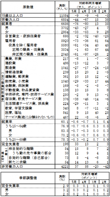 総務省統計局の5月の「労働力調査」によれば、就業者は6656万人と前年同月に比べて76万人減少した。雇用者は前年同月に比べて73万人減少の5920万人。いずれも2カ月連続の減少となった。