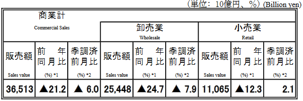 その5月の商業販売額は36兆5130億円で前年同月比21.2%減と大きく減少した。商業販売額は小売業と卸売業のすべての販売額である。