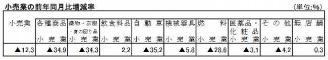 小売業のなかでは自動車小売業が前年同月比35.2%減、各種商品小売業(百貨店など)が34.9%減、織物・衣服・身の回り品小売業が34.3%減、燃料小売業が28.6%減、機械器具小売業が5.8%減、その他小売業が4.2%減、医薬品・化粧品小売業も3.1%の減少となった。一方、飲食料品小売業が2.2%の増加、無店舗小売業が同0.3%の増加となった。