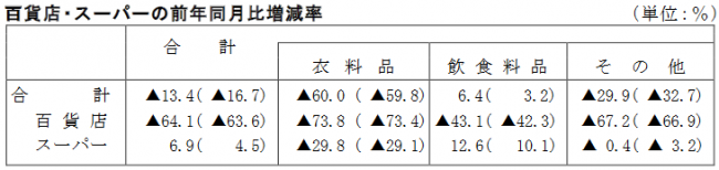 百貨店・スーパー販売額は1兆4555億円、前年同月比13.4%のマイナス。スーパーは1兆2811億円の6.9%増(既存店は4.5%増)だったが、百貨店は1744億円の64.1%減(既存店は63.6%減)の大幅減収となった。商品別では衣料品が60.0%減と大幅に減少したが、飲食料品は6.4%増加した。