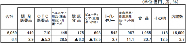 経済産業省発表「商業動態統計速報」によれば、5月のドラッグストア販売額は6069億円、前年同月比6.4%増となった。店舗数は前年より3.7%増加して1万6609店で、前月に比べて61店舗増えている。