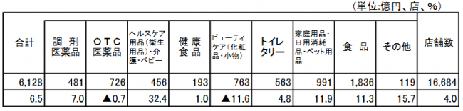 カテゴリー別に見ると、ヘルスケア用品(衛生用品)・介護・ベビーが32.4%増、その他が15.7%増、家庭用品・日用消耗品・ペット用品が11.9%増、食品が11.3%増、調剤医薬品が7.0%増、トイレタリーが4.8%増、健康食品が1.0%増加となった。一方、ビューティケア(化粧品・小物)が11.6%減、OTC医薬品が0.7%の減少となった。