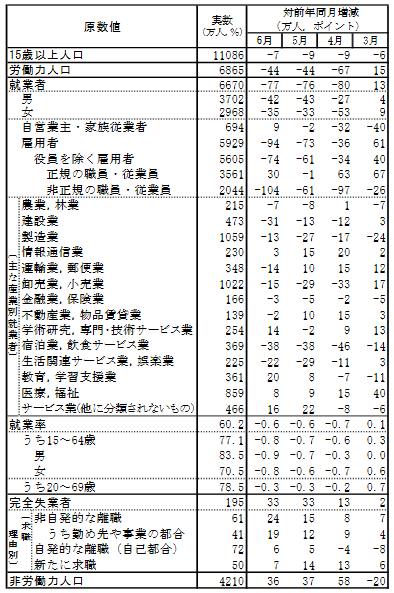 6月労働力調査|就業者数6670万人で3カ月連続減少、完全失業率2.8%