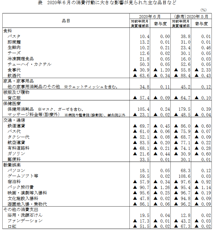 前年同月と比べた6月の消費行動で大きな影響が見られた主な品目は、「教養娯楽」の映画・演劇等入場料95.6%減、パック旅行費90.7%減。「食料」の飲酒代は63.6%減で前月からは少し回復したものの、落ち込みは続く。また、「交通・通信」の航空運賃は83.5%減、鉄道運賃も69.7%減。「その他の消費支出」のなかでは口紅が51.5%減と大幅に減った。