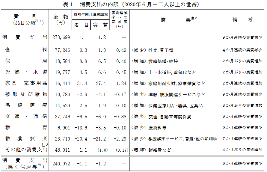 総務省統計局発表の「家計調査報告」によれば、6月の2人以上の世帯の消費支出は27万3699円と、物価変動の影響を取り除いた「実質」で前年同月比1.2%減少だった。最大の落ち込みだった前月からは13ポイント回復した。
