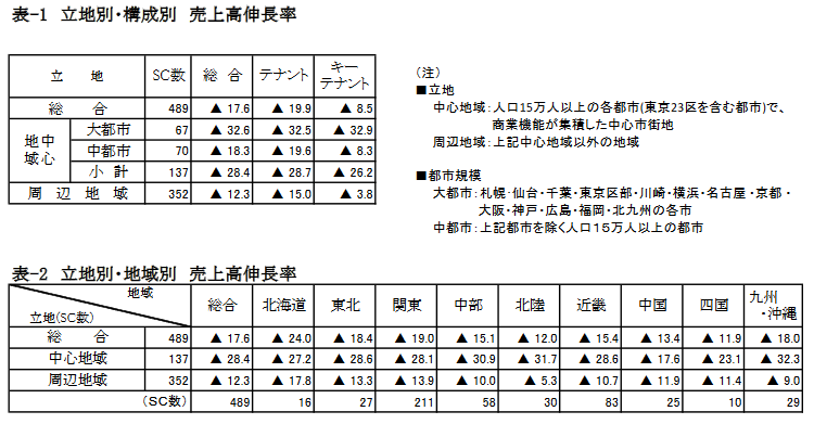 テナントは前月から2.8ポイント減の19.9%減、キーテナントは前月から1.5ポイント減の8.5%減となり、ともにマイナス幅が広がった。