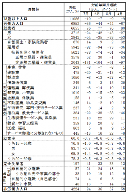総務省統計局の7月の「労働力調査」によれば、就業者は6655万人と前年同月に比べて76万人減少した。雇用者は前年同月に比べて92万人減少の5942万人。4カ月連続で減少傾向が続いている。就業率は60.0%と、前年同月に比べ0.7ポイントの低下となった。