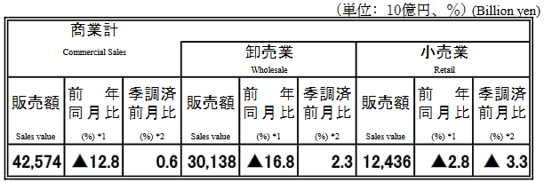 その7月の商業販売額は42兆5740億円で前年同月比12.8%の減少となった。商業販売額は小売業と卸売業のすべての販売額である。