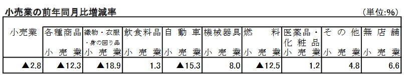 小売業のなかでは織物・衣服・身の回り品小売業が前年同月比18.9%減、自動車小売業が15.3%減、燃料小売業が12.5%減、各種商品小売業(百貨店など)が12.3%の減少となった。一方、機械器具小売業が8.0%増、無店舗小売業が6.6%増、その他小売業が4.8%増、飲食料品小売業が1.3%増、医薬品・化粧品小売業が1.2%の増加となった。
