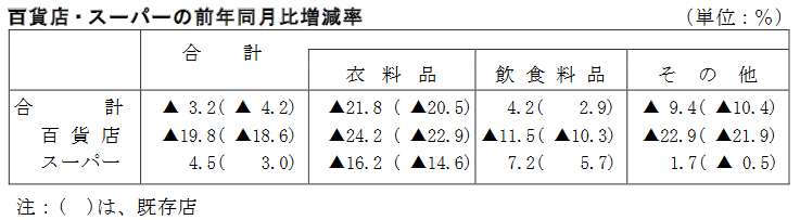 百貨店・スーパー販売額は1兆6918億円、前年同月比3.2%のマイナス。スーパーは1兆2575億円の4.5%増(既存店は3.0%増)だったが、百貨店は4343億円の19.8%減(既存店は18.6.%減)の減収となった。商品別では衣料品が21.8%減だが、飲食料品は4.2%増加した。
