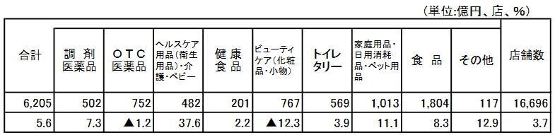 カテゴリー別に見ると、一番の伸びを示したヘルスケア用品(衛生用品)・介護・ベビーが37.6%増、二番目の家庭用品・日用消耗品・ペット用品が11.1%増、三番目の食品が8.3%増、さらに調剤医薬品7.3%増、トイレタリー3.9%増、健康食品2.2%増と続く。だが、ドラッグストアのもう一方の核カテゴリーのビューティケア(化粧品・小物)は12.3%減、OTC医薬品が1.2%の減少となった。