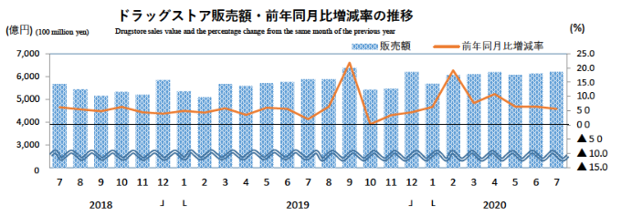 経済産業省発表「商業動態統計速報」によれば、7月のドラッグストア販売額は6205億円、前年同月比5.6%増となった。店舗数は前年より3.7%増加して1万6684店で、前月に比べて12店舗増えている。