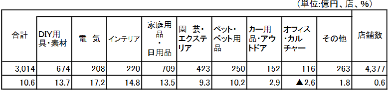 カテゴリー別に見ると、電気が17.2%増、インテリアが14.8%増、DIY用具・素材が13.7%増、家庭用品・日用品が13.5%増、ペット・ペット用品が10.2%増、園芸・エクステリアが9.3%増、カー用品・アウトドアが2.9%増、その他が1.8%増となった。一方、オフィス・カルチャーが2.6%の減少となった。