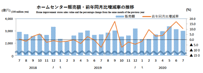 経済産業省発表の「商業動態統計速報」によるホームセンター7月の販売額は3014億円で、前年同月比10.6%の増加となった。総店舗数は6月から5店舗増えて、4377店舗。