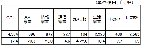 カテゴリー別では、情報家電が23.0%増、AV家電が20.3%増、生活家電が10.4%増、その他が7.7%増、通信家電が4.6%増加となった。一方、カメラ類が22.0%の減少となった。