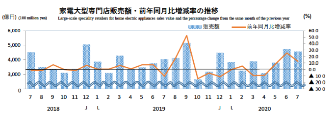 経済産業省発表「商業動態統計速報」によれば、7月の家電大型専門店の販売額は4564億円で、前年同月より12.4%上回った。店舗数は前年比1.9%増の2565店。