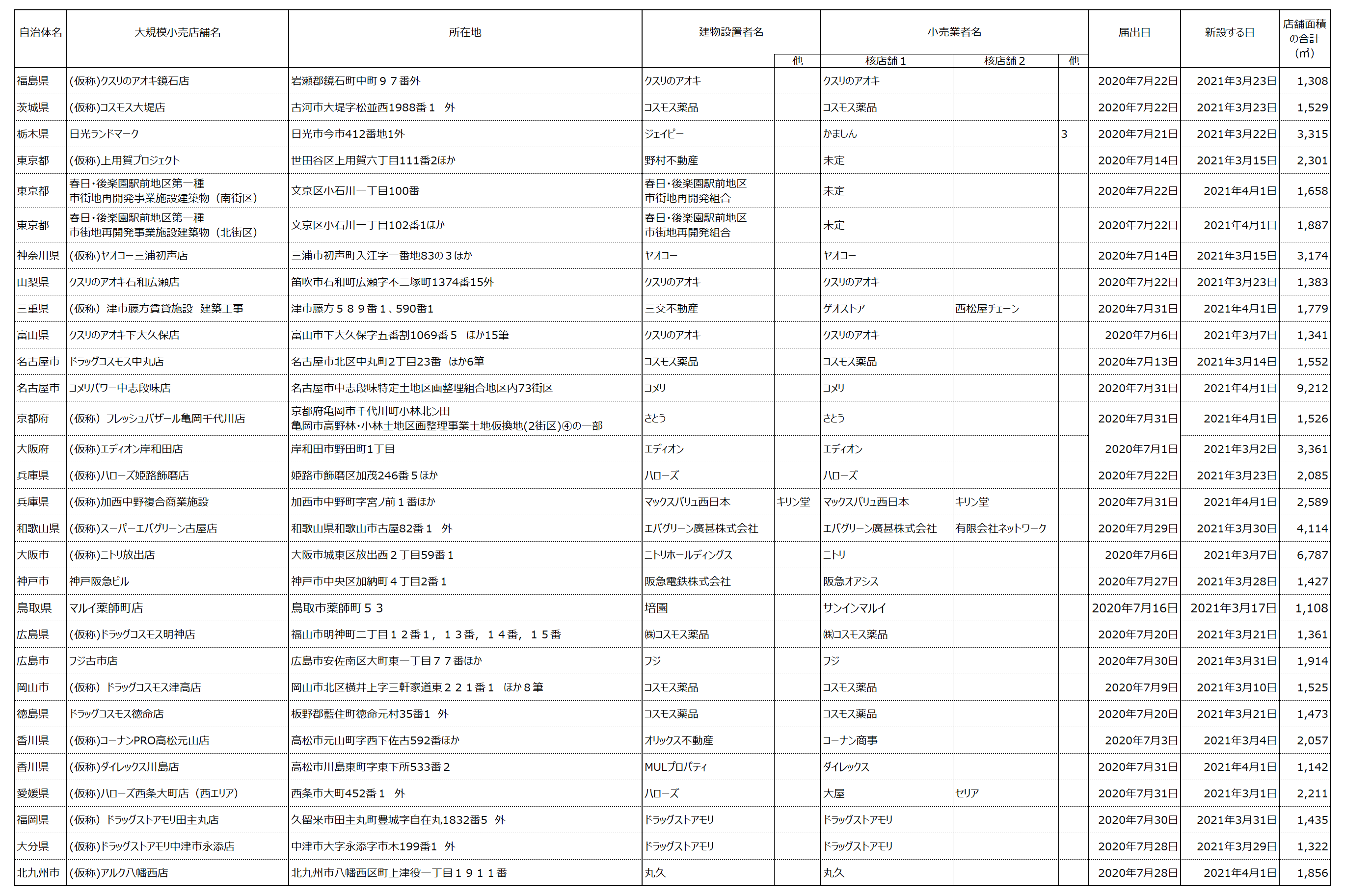 経済産業省から7月の「大規模小売店舗立地法にともなう新設届出申請」が発表された。申請件数は30件。