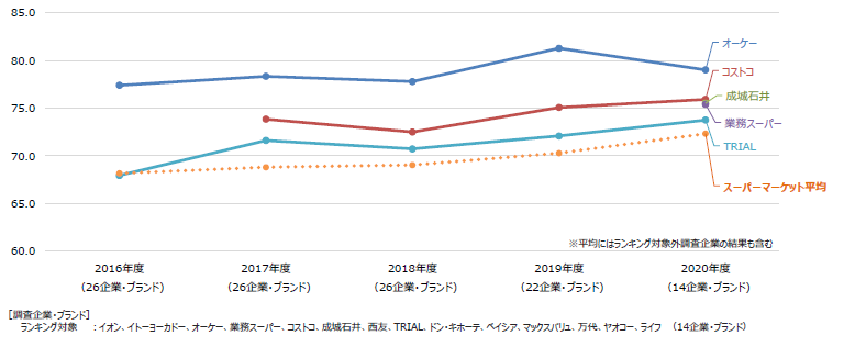 オーケーは2018年度から2019年度にかけてスコアは上昇したが、2020年度は低下した。コストコは2018年度から2年連続でスコアを上昇させた。
