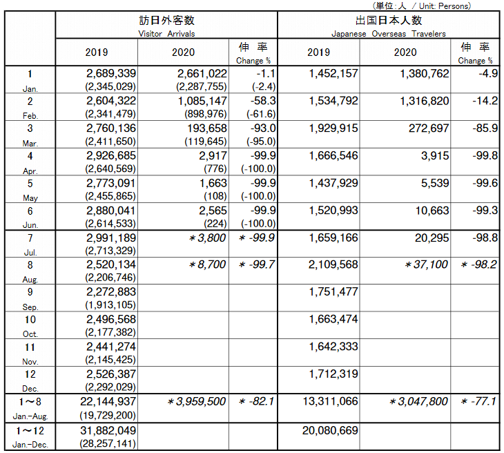 日本政府観光局(JNTO)発表の速報値では、2020年8月の訪日外客数は8700人の前年同月比99.7%減となり、11カ月連続で前年同月を下回った。