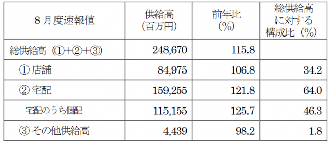 内訳は、店舗が849億7500万円(前年同月比6.8%増)、宅配が1592億5500万円(21.8%増)。この宅配のうち、個人宅への配達である「個配」は1151億5500万円(25.7%増)。灯油・葬祭などの「その他供給高」は44億3900万円(1.8%減)。